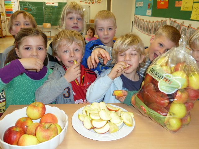 Obsthof Weber liefert uns einmal in der Woche Obst der Saison. So können die Kinder zusätzlich zu ihrem Pausebrot täglich frisches Obst genießen.